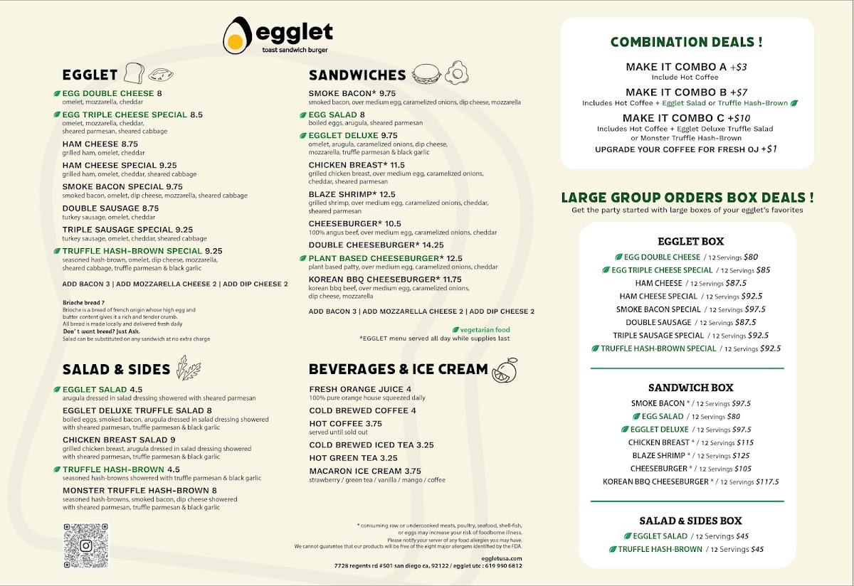 If you're looking for something unique to satisfy your cravings, the Egglet Menu at this San Diego gem is a must-try. Located at 7728 Regents Rd, this spot brings you a fresh twist on the traditional waffle with their delicious egglets. These light, crispy treats come in a variety of flavors and fillings that will surprise and delight your taste buds with every bite. Whether you’re in the mood for something sweet like chocolate and vanilla or something more savory, there’s something for everyone.